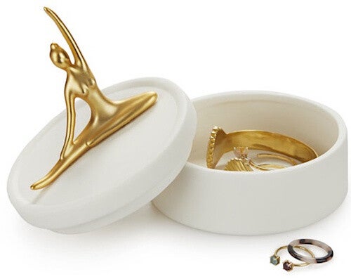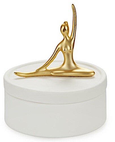 Porseleinen juwelendoosje van Balvi. Rond sieradendoosje in een witte kleur. Op het deksel zit een goudkleurige vrouw die yoga doet van keramiek, waaraan het deksel opgetild kan worden. Het sieradendoosje is geschikt om ringen, armbanden en oorbellen in op te bergen. Ook mooi om gewoon neer te zetten of om kleine rommeltjes in op te bergen.